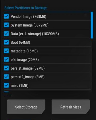 - Take a full Nandroid backup of your device from TWRP, this includes EFS, Persist, FSG, Firmware, Modem, Bluetooth & DSP partitions